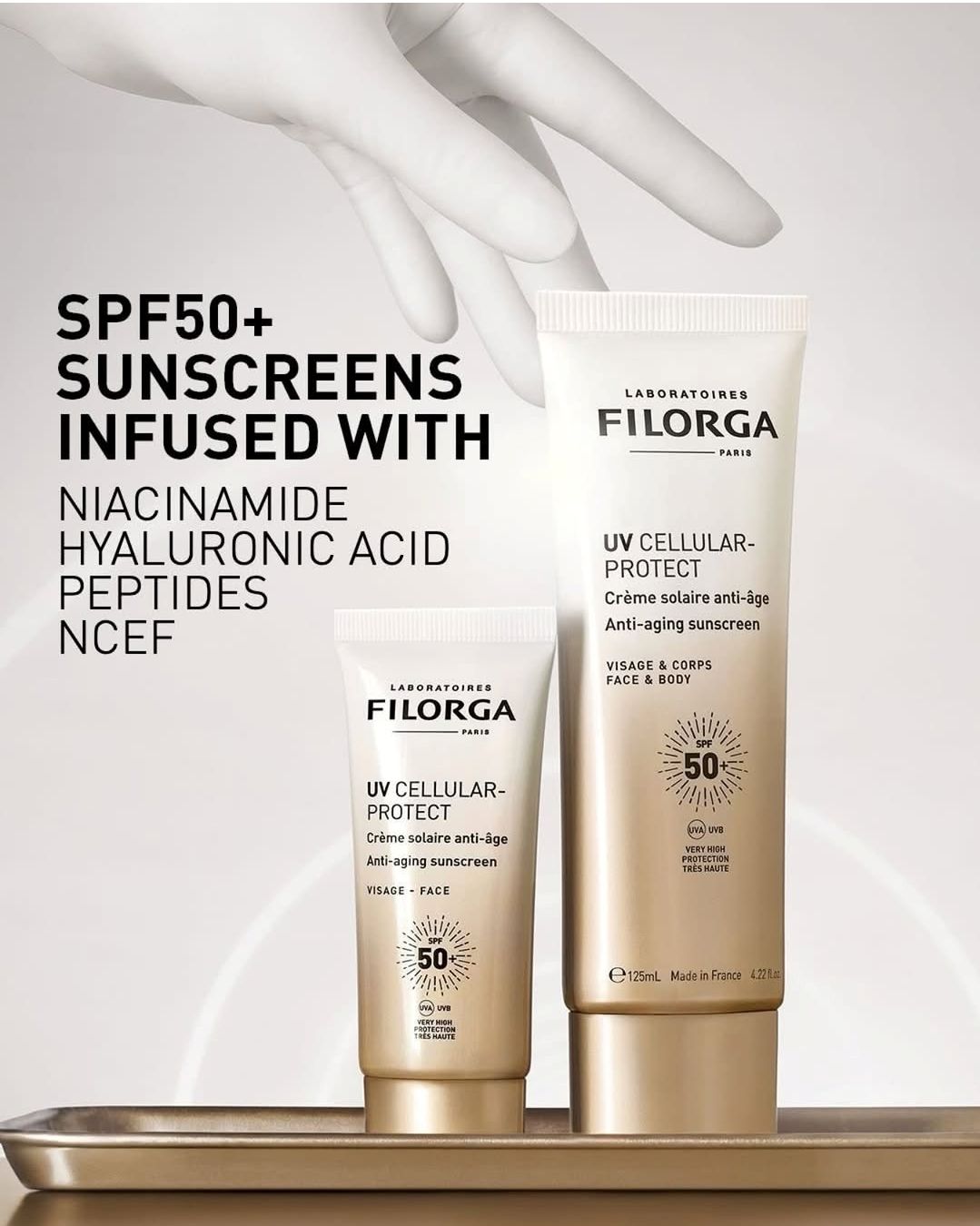 Filorga UV Cellular Protect SPF50+ is a high-performance anti-ageing sunscreen that delivers full-spectrum protection for both face and body. Developed with Filorga’s photo-activated technology, it shields against UVA, UVB, infrared and blue light, helping prevent wrinkles, dark spots and premature ageing.